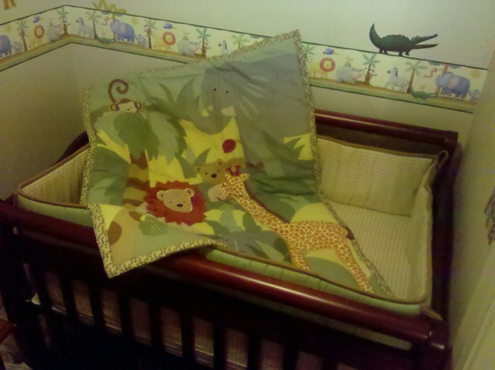 Speaking of our new little son.... We finally got the nursery COMPLETELY finished! Crib bedding arrived, washed, and put in the crib! Hooray! And we found a fishy crib toy just like Justin's to put in the crib. Justin still loves the music and lights at bedtime and we didn't want to taint the relationship between him and baby brother by taking his fish away and giving it to the "new guy". So we found one on Amazon and I am so glad we found one when we did! They've stopped making them, and had only 3 gently used ones available through Amazon. And the crib mobiles and other toys they make nowadays just aren't as cute or entertaining in my opinion. The fish have colorful lights, several soothing songs/ocean sounds, real bubbling water with *swimming* fish... they're just dang cute. =) So now we have 2 of the fish. Hopefully they will last through the rest of our kids. Of course, if our new little baby loves and gets as attached to HIS fish as Justin has, we may have to find something else! LOL! I'm sure one or both of the boys will eventually grow out of the fish... right?? =)